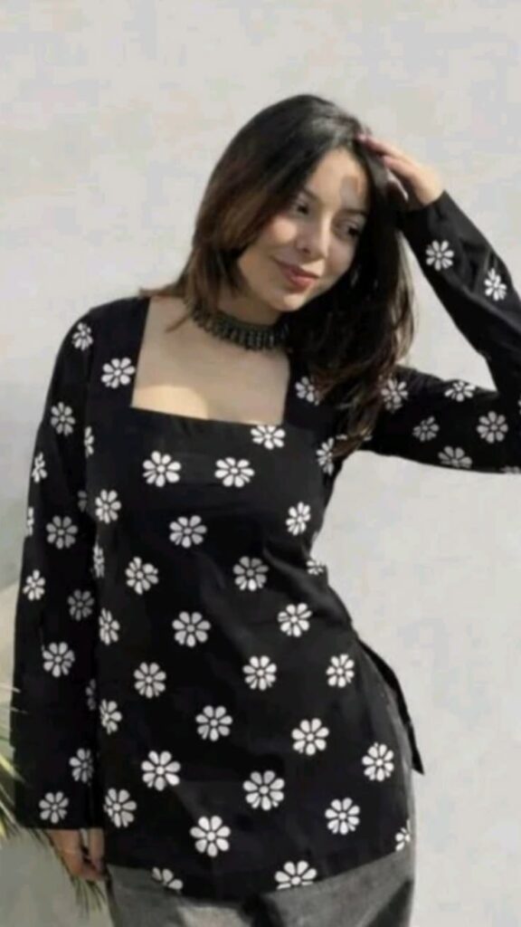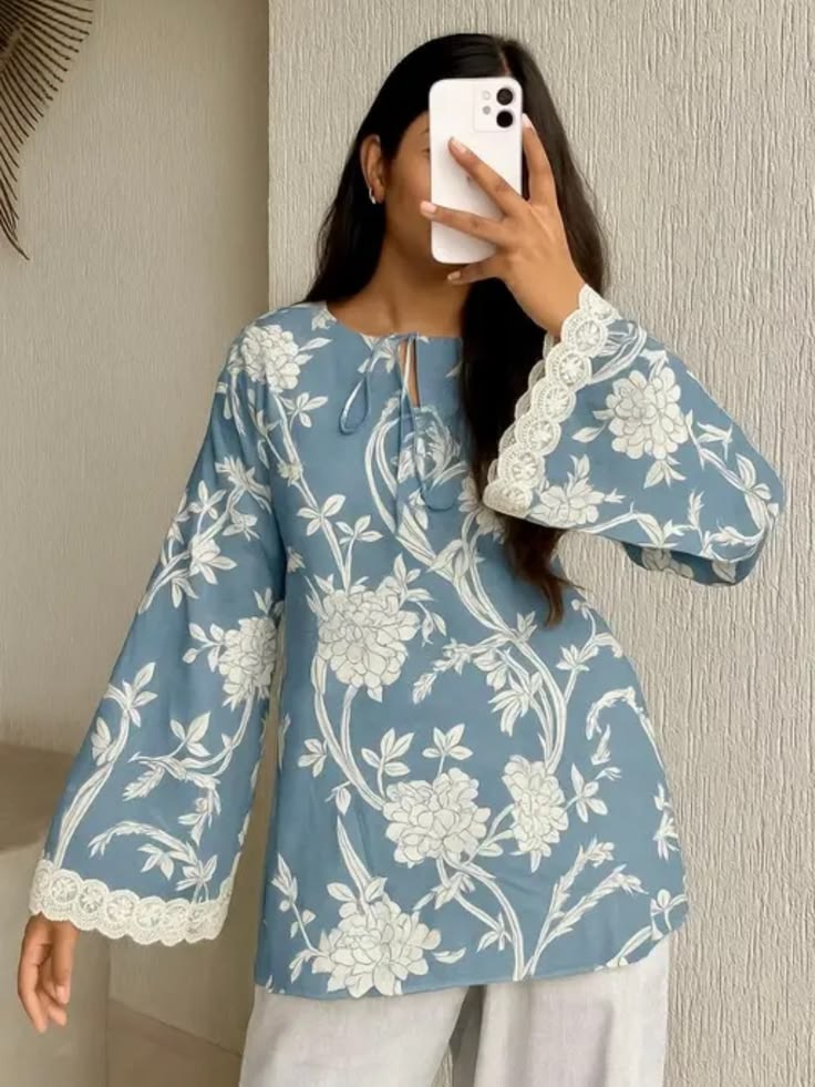 Upgrade your everyday style with this elegant blue floral short kurti featuring soft fabric and stylish lace-detailed sleeves. Perfect for casual wear and daily comfort.
