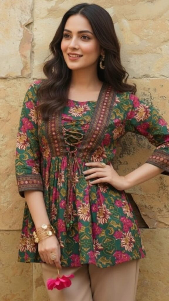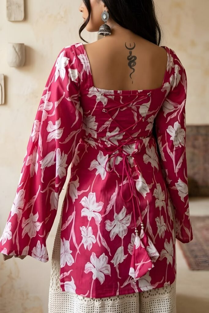 Elegant short kurti featuring a trendy back design, perfect for adding a unique and stylish touch to your ethnic look.