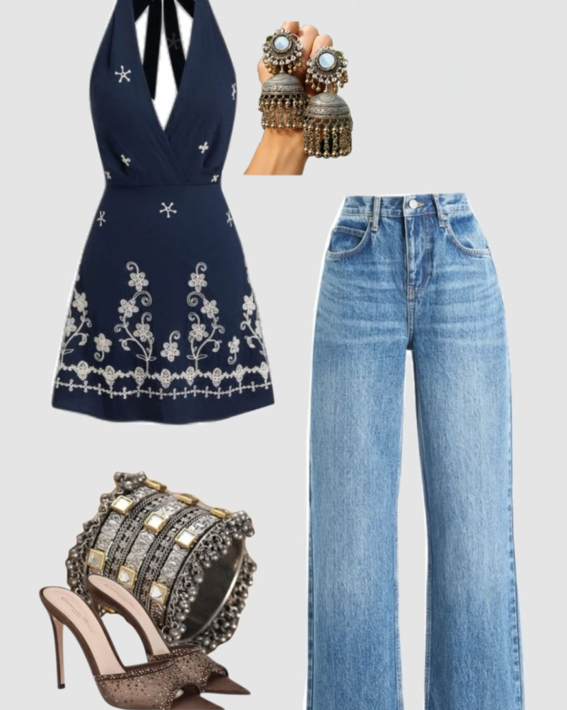 This ethnic fashion look perfectly blends modern and traditional style. The navy blue embroidered top adds a classy ethnic touch, while the wide-leg jeans give a trendy western vibe. Oxidised jhumka earrings and statement bangles enhance the traditional feel of the outfit. The heels complete the look with elegance and style. This outfit is perfect for college, casual outings, or day events. It is a great example of ethnic fashion for women with a modern twist.