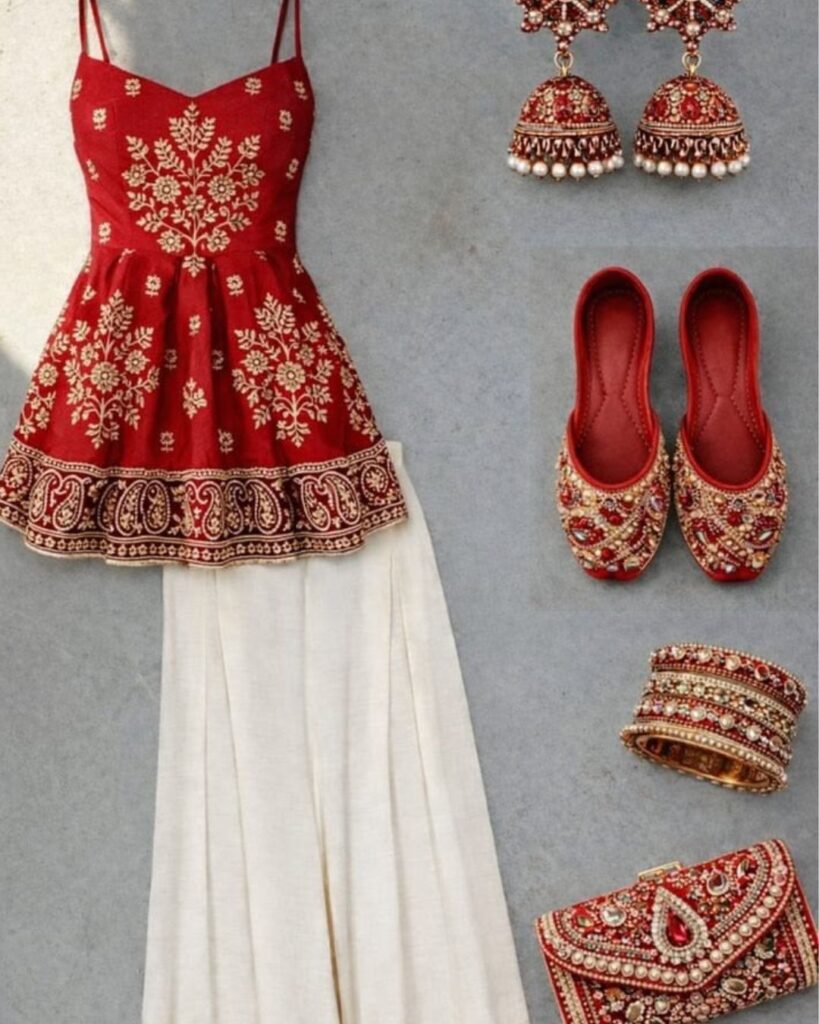 This ethnic fashion look is perfect for festive and traditional occasions. The red embroidered top adds a rich and elegant vibe, while the white palazzo gives a balanced and graceful look. Matching jhumka earrings and bangles enhance the traditional style beautifully. The embroidered juttis and clutch complete the outfit with a royal touch. This outfit is ideal for weddings, festivals, and special events. It is a stunning example of ethnic fashion for women with a classy and traditional feel.